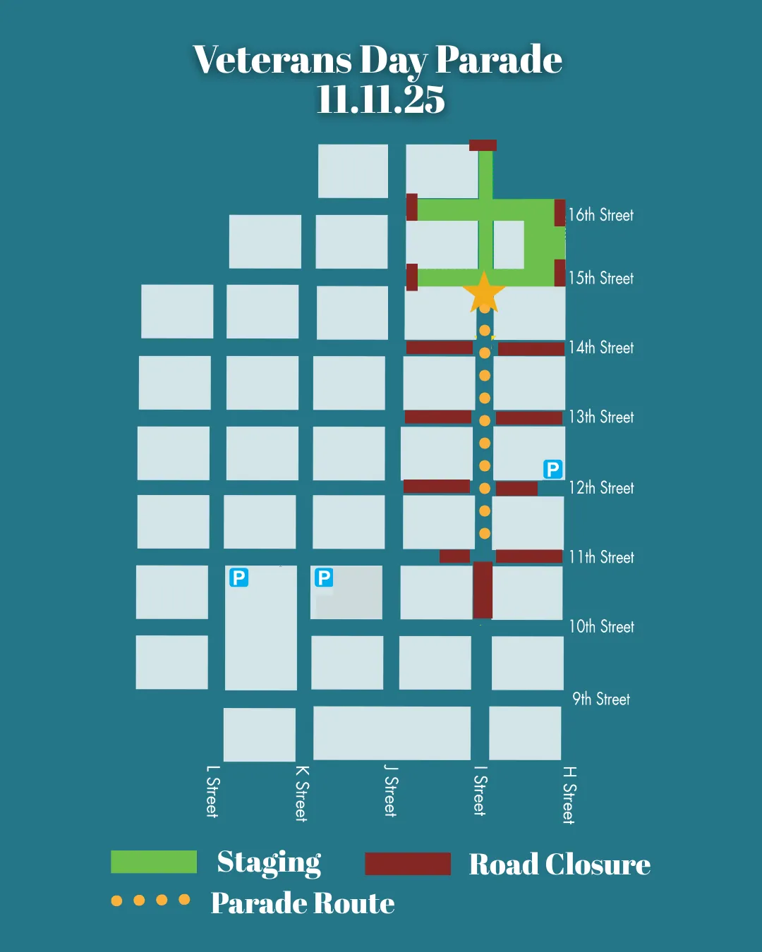 The parade vehicles will travel down "I" Street and end at the